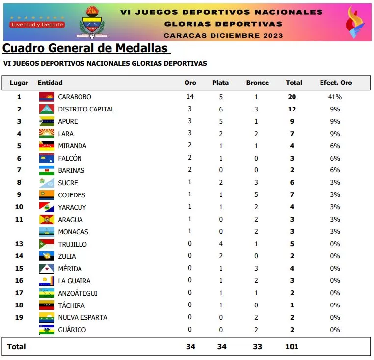 La Delegación de Carabobo fue la gran triunfadora del torneo al obtener 14 medallas de oro, seis de plata y una de bronce, casi en su totalidad en las disciplinas de Atletismo, cuyas competencias se desarrollaron en el Estadio Olímpico Nacional Brígido Iriarte de Caracas durante los días 8 y 9 de diciembre.