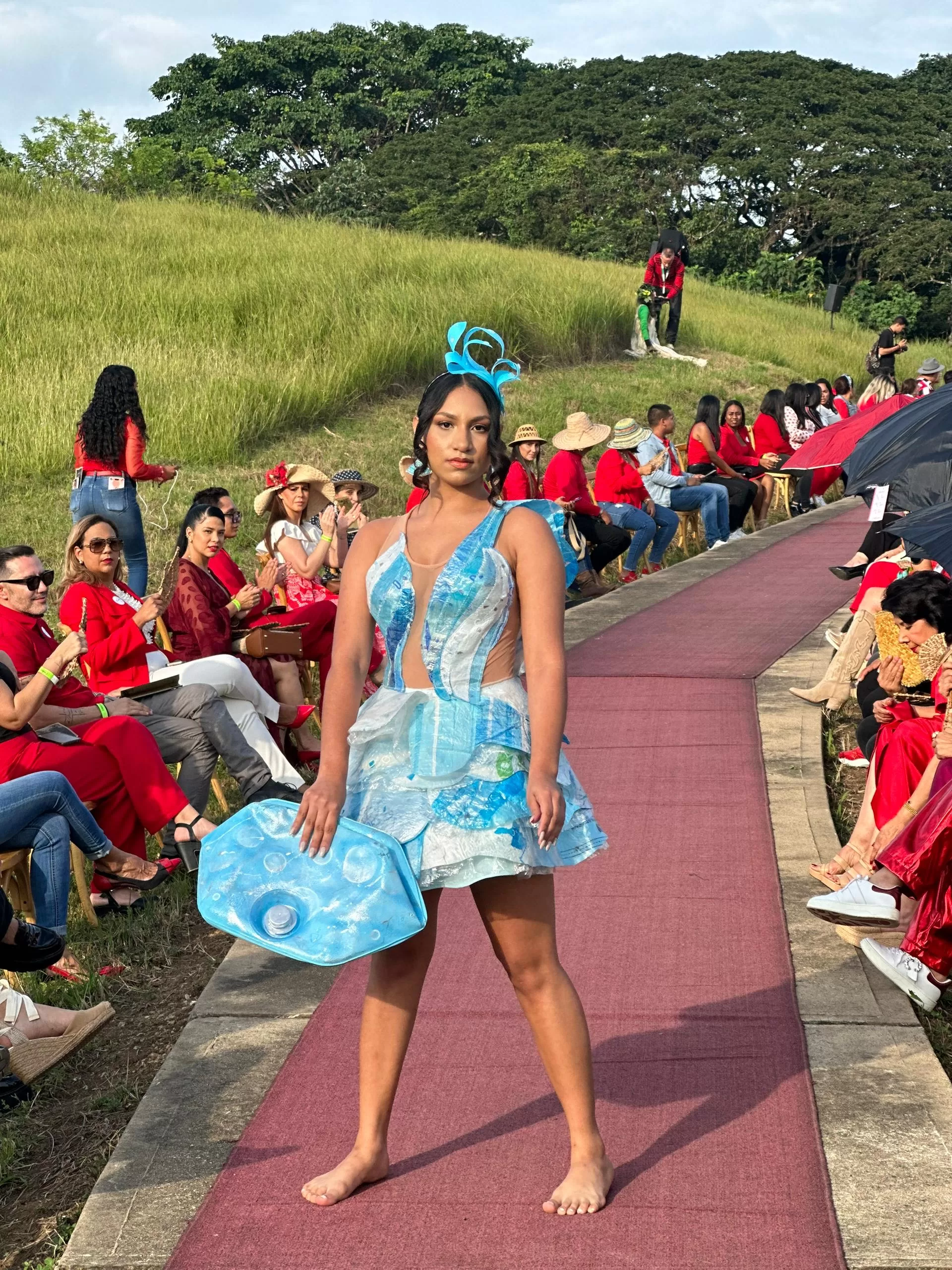 El municipio Naguanagua presentó en sus diseños la colección “Nuestra Bellísima”, inspirada en la flor emblemática de Naguanagua, utilizando la técnica de ‘upcycling’ para su creación y haciendo uso de materiales de plástico de botella reciclada y jean reutilizado, que se acompañó creativamente, de accesorios con recortes de CD con efecto espejo.